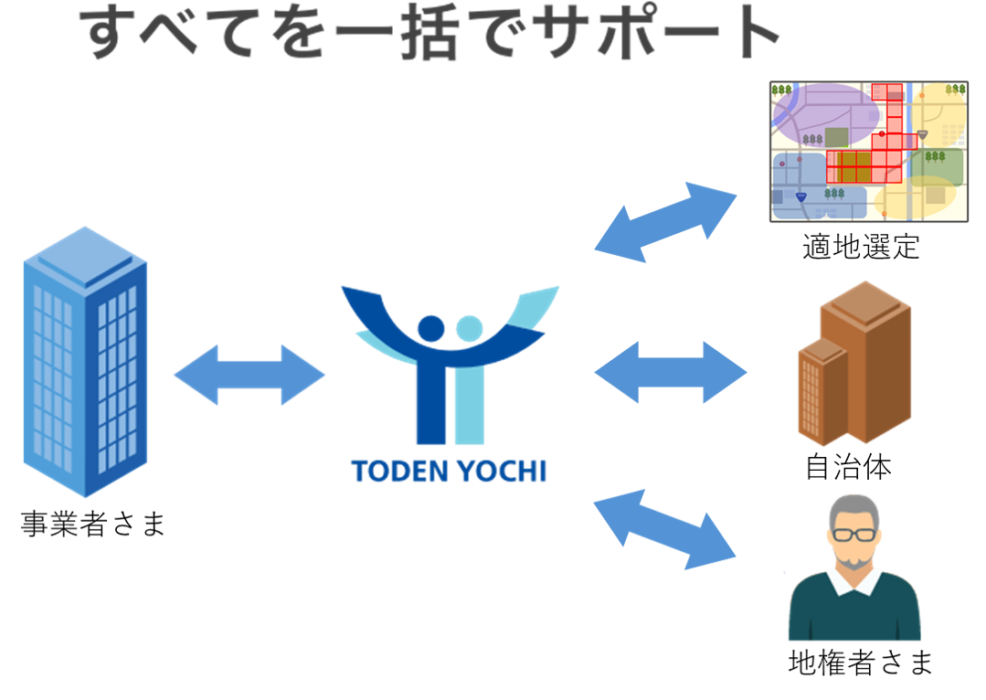 太陽光発電所や蓄電所は土地探しから始まりますが、単に土地を見つけたからといって、簡単に設置できるものではありません。現地状況や土地に係る関係法令の調査による事業者様のニーズに沿った適地選定、さらには行政対応や権利状況の確認、土地権利者との協議・交渉など、計画から設置までに発生するさまざまな課題を解決するべく弊社が⼀貫してサポートします。