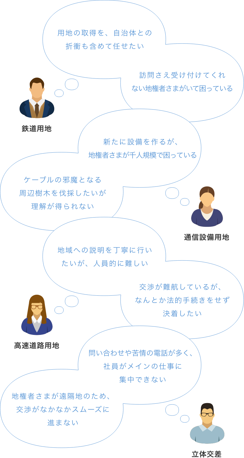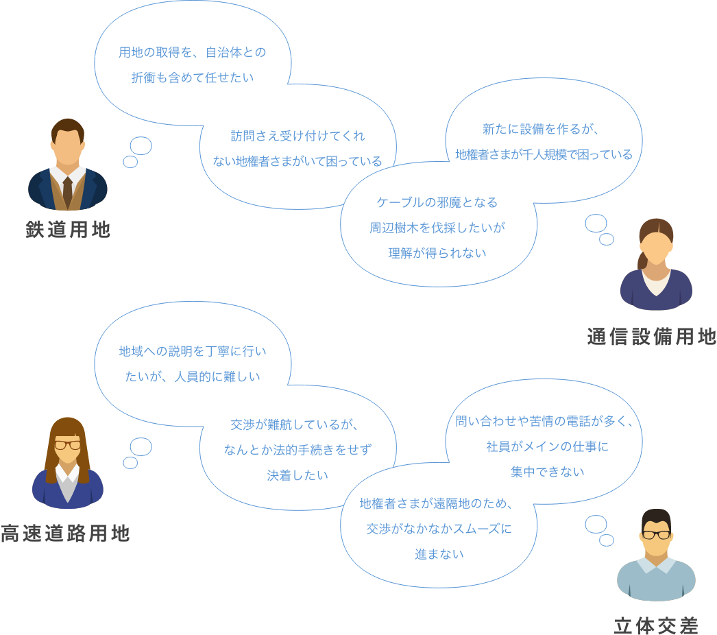 例えば自治体との折衝が不可⽋な鉄道⽤地、多種多様の交渉が伴う通信設備の新設や更新、多くの地権者との交渉が課題となる⾼速道路や立体交差。