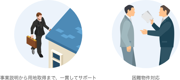 交渉にまつわる様々な業務を一括してサポート。困難物件も自治体さまと同じ⽬線で粘り強く交渉し、信頼をもとに解決へ導きます。